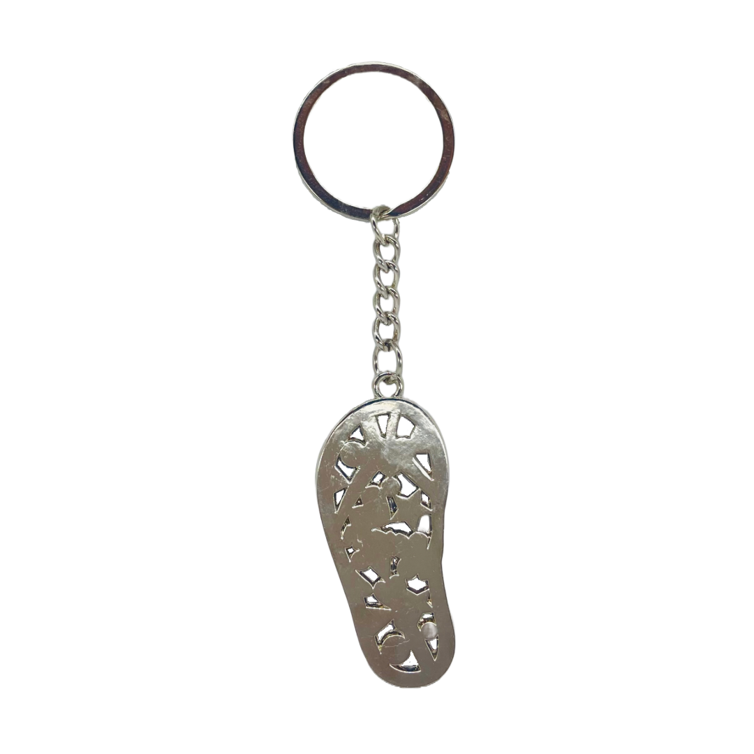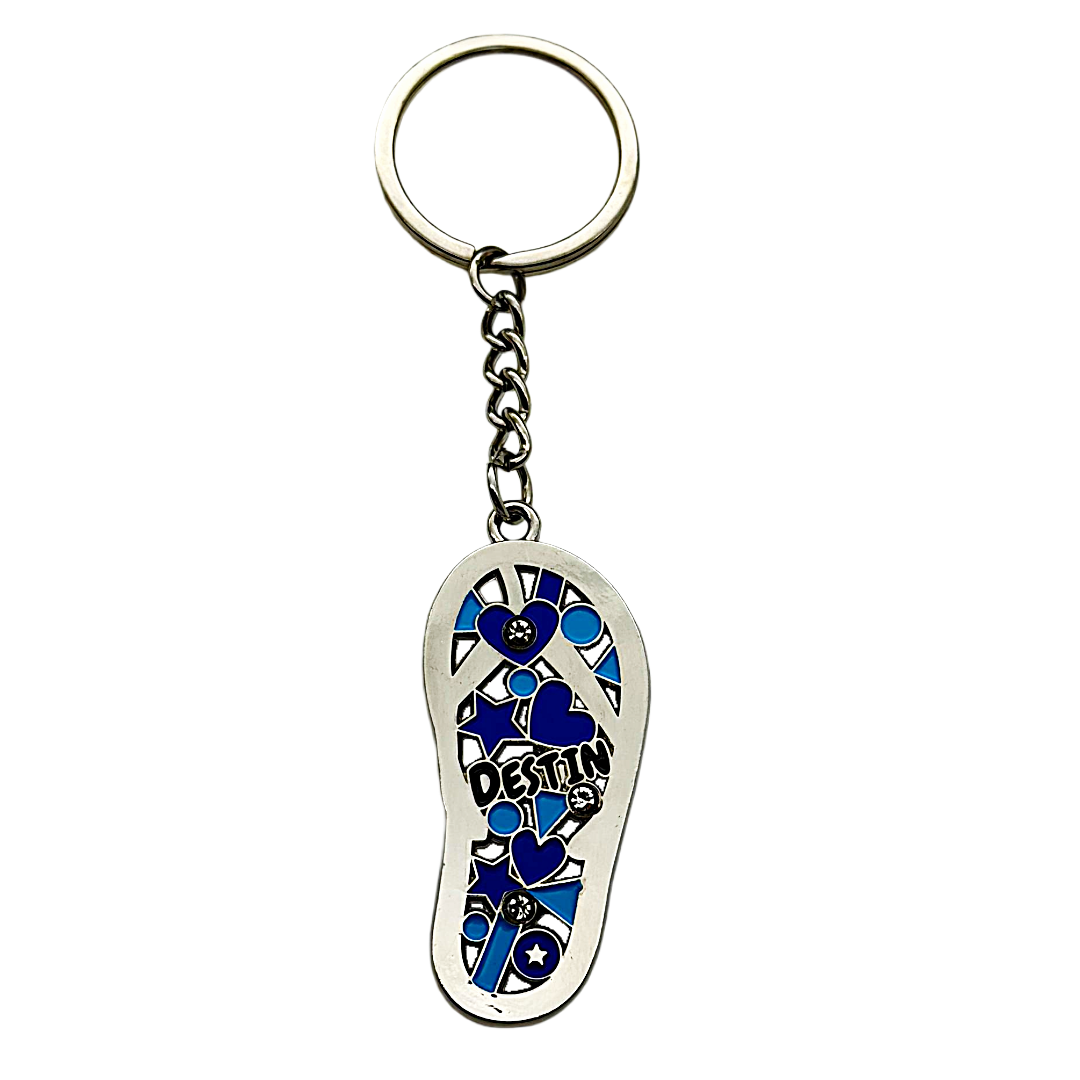 Metal key chain shaped like a sandal 2" (50.8mm). This Destin, Florida Souvenir Keyhain has dark and light blue accents adorning the sandal. Order in quantities of 6.