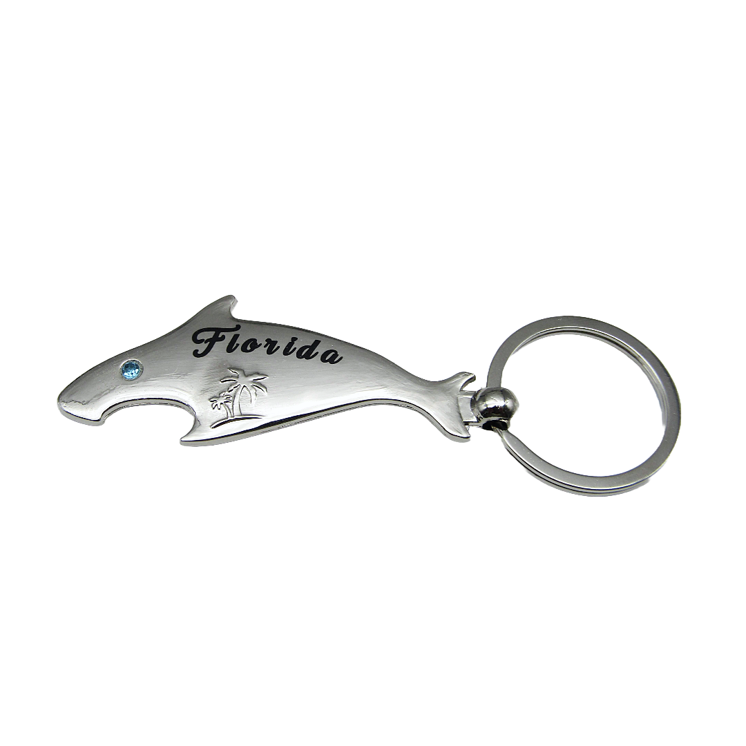 Shark shaped metal bottle opener key chain. Shark has a light blue gemstone eye. Approximately 3in long.