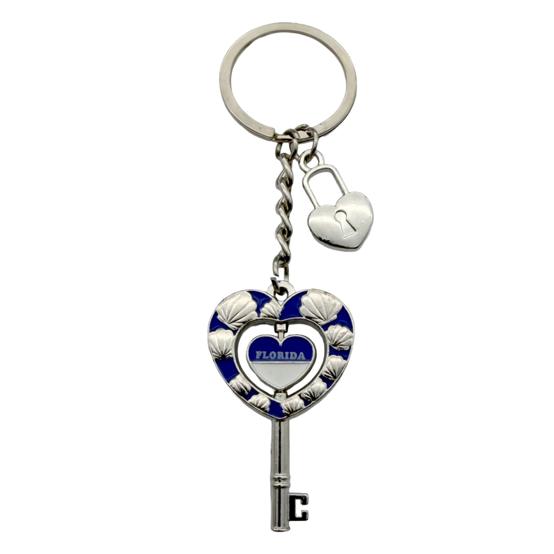 Metal keychain shaped like a mini heart shaped key. The heart is filled with blue enamel and silver colored shells. Within the heart is a floating mini blue and white enamel heart with Florida stamped in the middle.