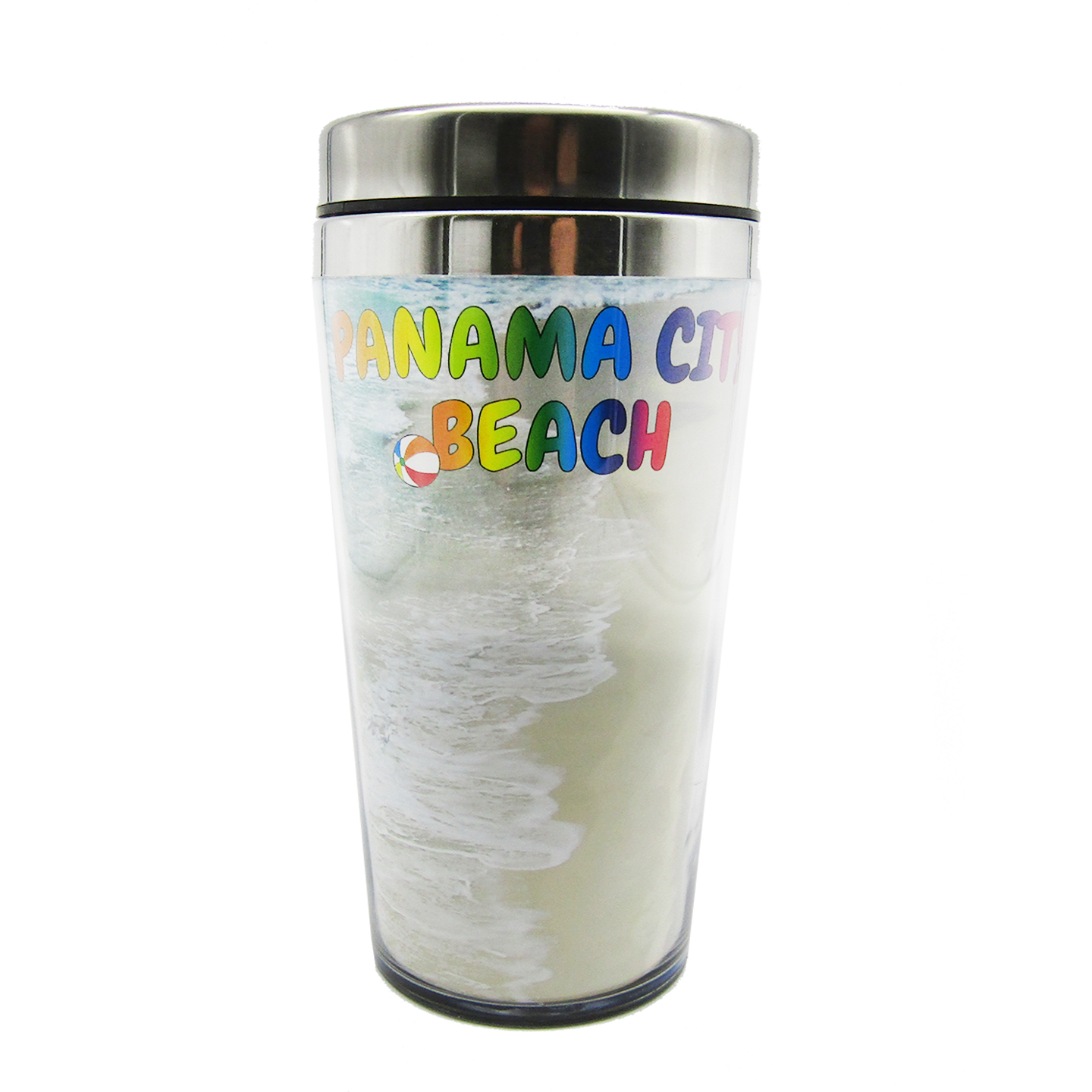 Insulated Travel mug. Lid has silica gasket seal to prevent leaks and spills. Lid top, slides open to sip