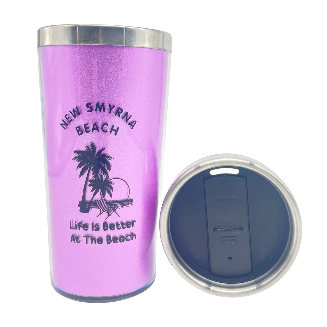 Insulated Travel mug. Lid has silica gasket seal to prevent leaks and spills. Lid top, slides open to sip